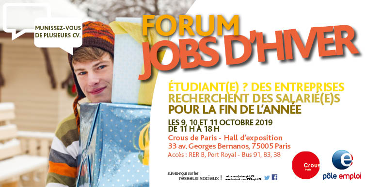 Afin de répondre aux besoins des entreprises pendant la période des fêtes de fin d’année et de faciliter la recherche d’emploi des étudiants, Pôle emploi Service Etudiant, en partenariat avec le Crous de Paris, organise le Forum Jobs d’Hiver.